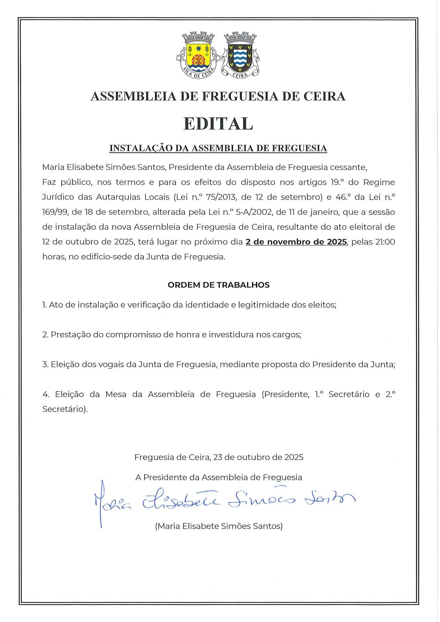 Edital - Instalação da Assembleia de Freguesia - Quadriénio 2025/2029