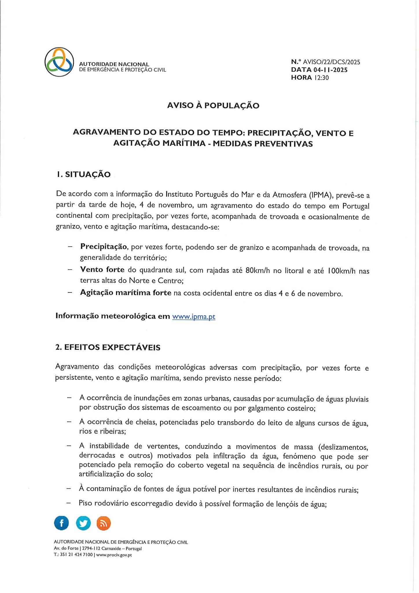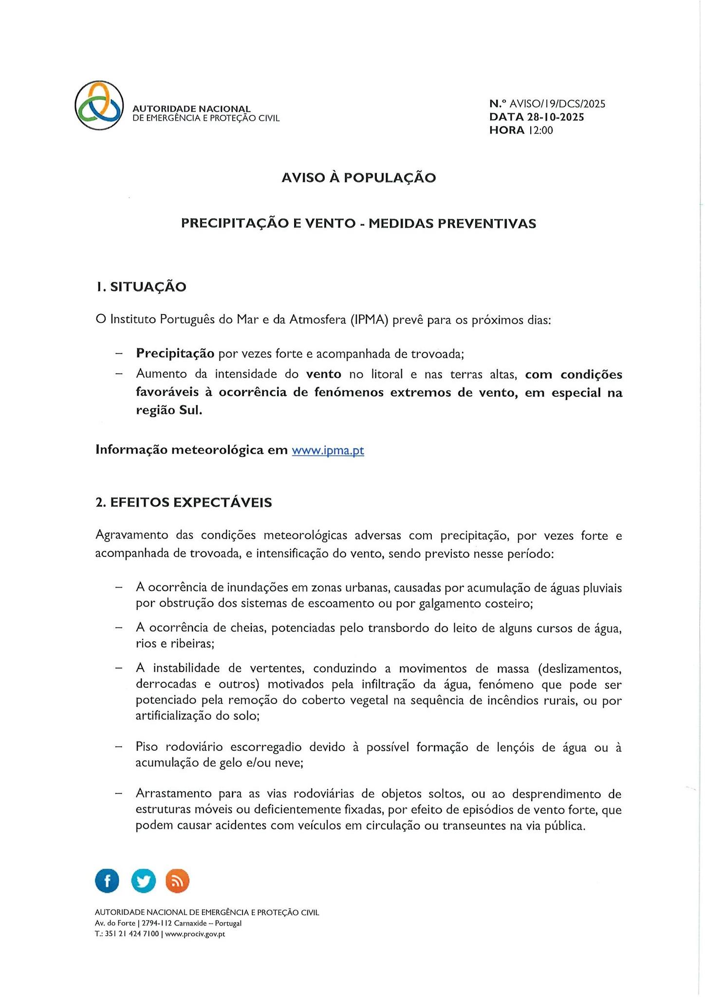 Aviso à População - Precipitação e Vento - Medidas preventivas