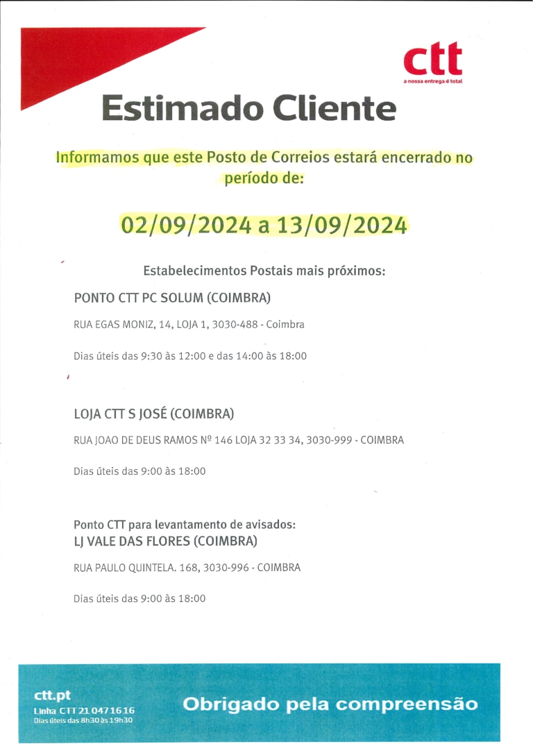 Posto CTT de Ceira encerrado para férias (02/09 a 13/09/2024)