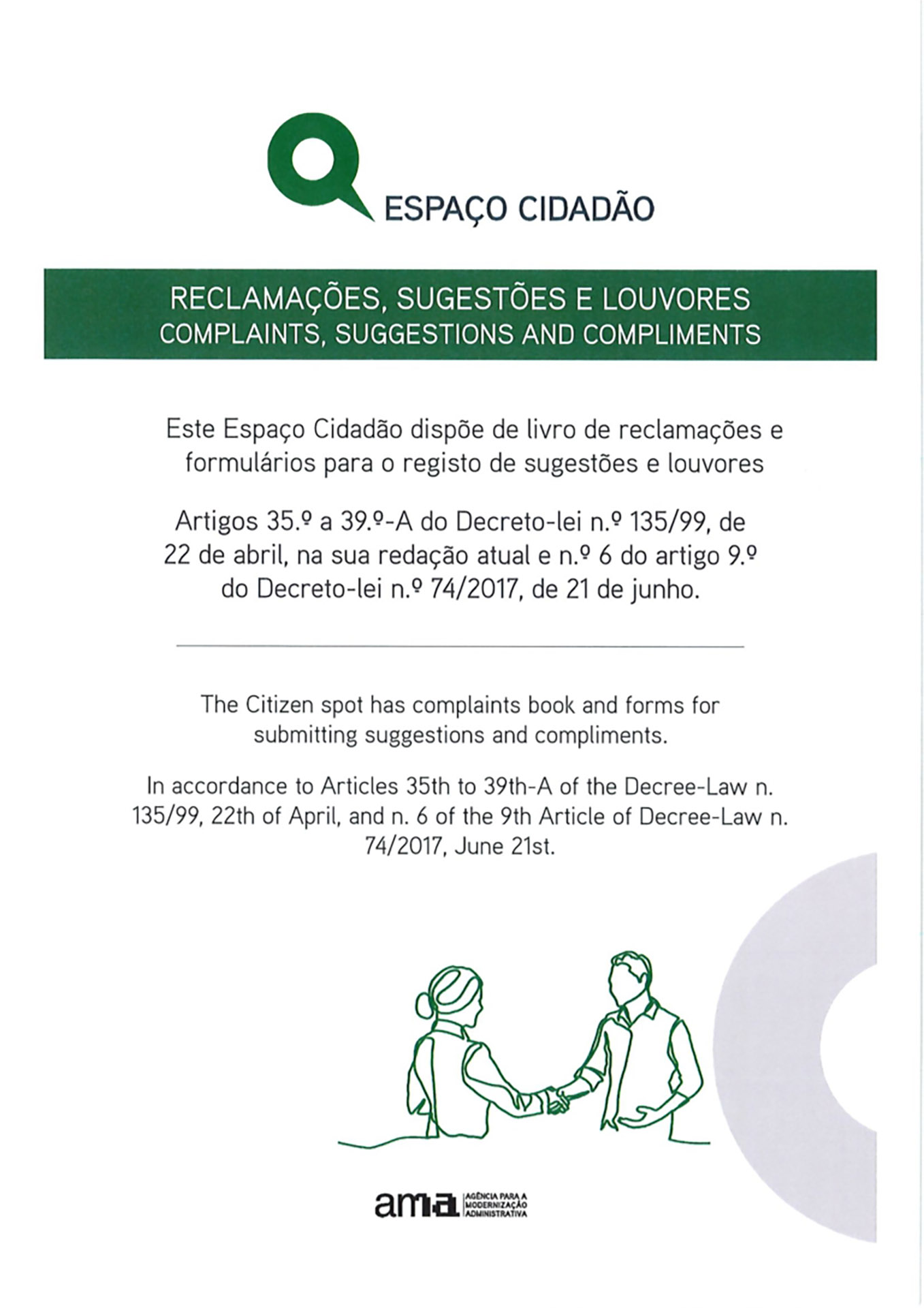 Este Espaço Cidadão dispõe de livro de reclamações e formulários para o registo de sugestões e louvores.